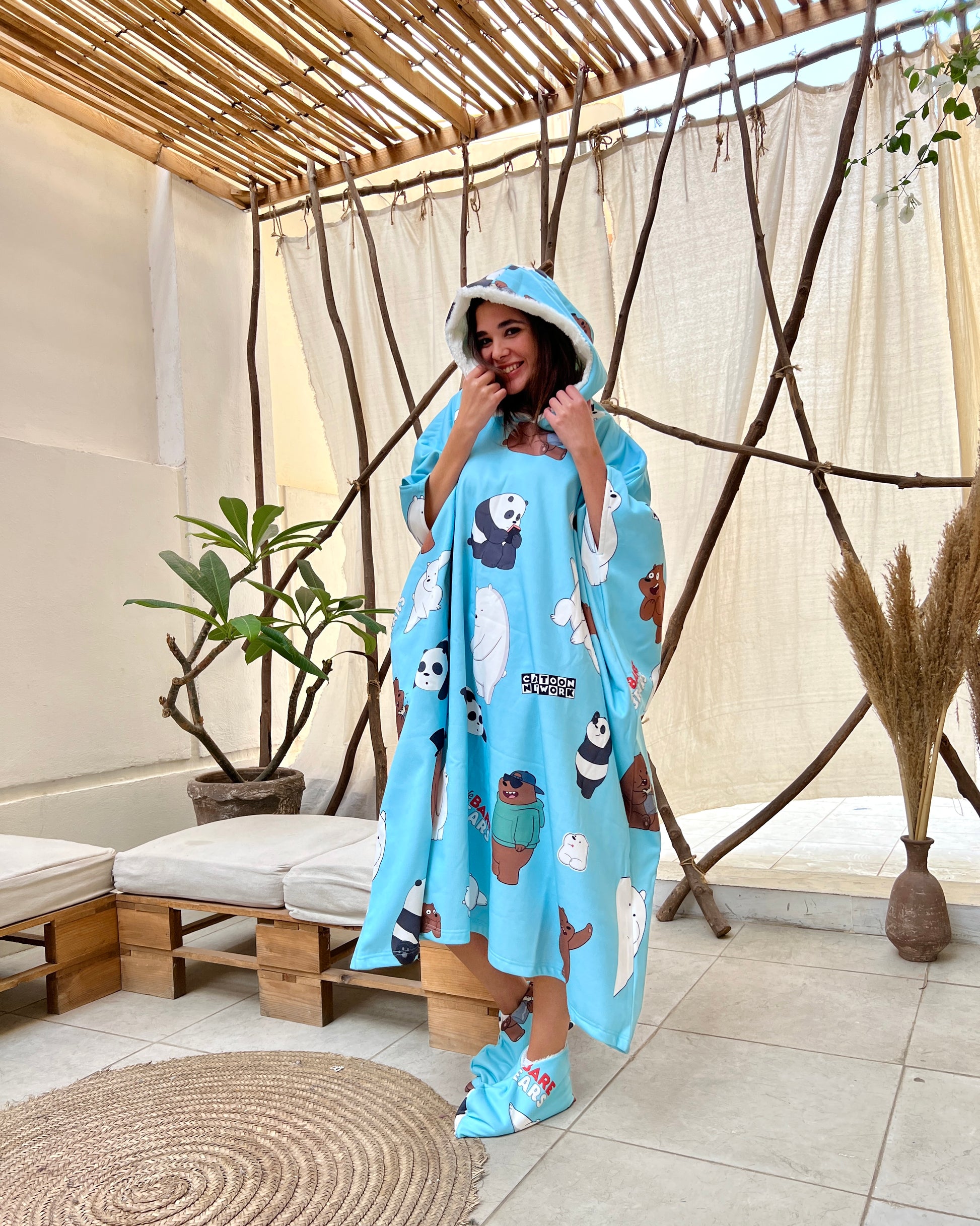 This oversized wearable blanket includes a large hood, two spacious side pockets, and matching fur socks — everything you need to stay snug and relaxed wherever you are.