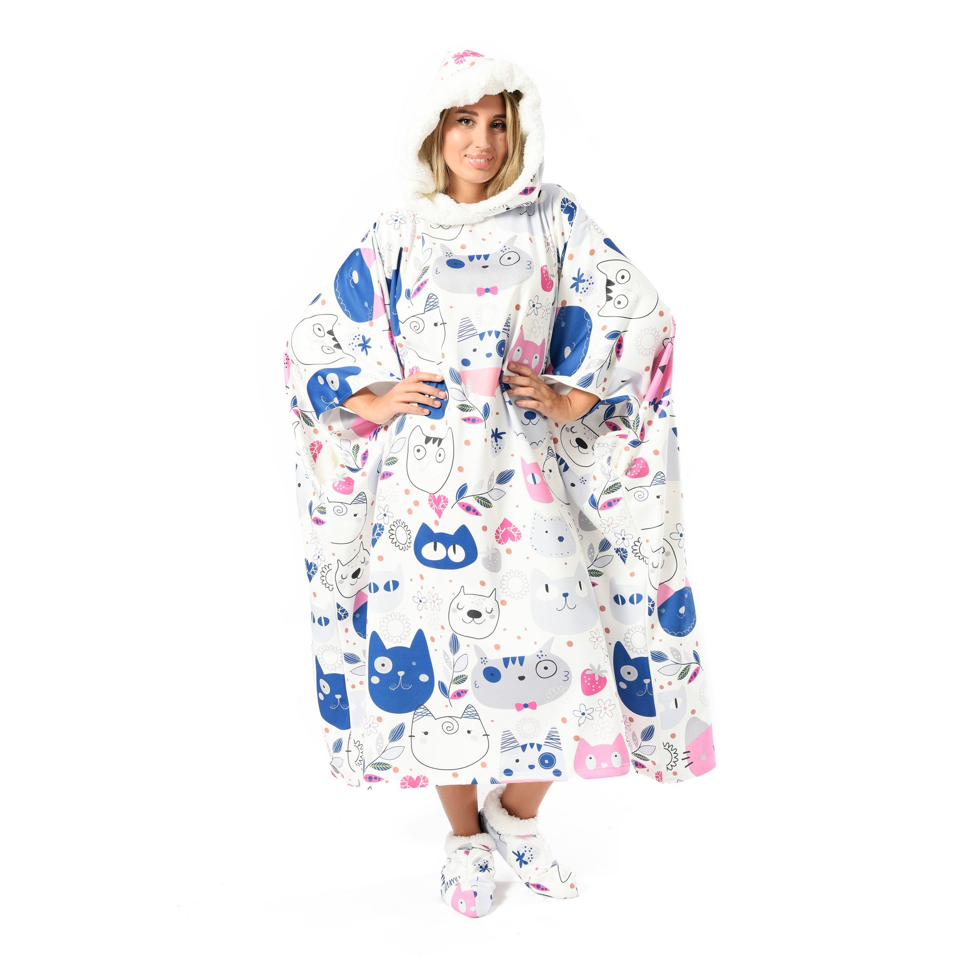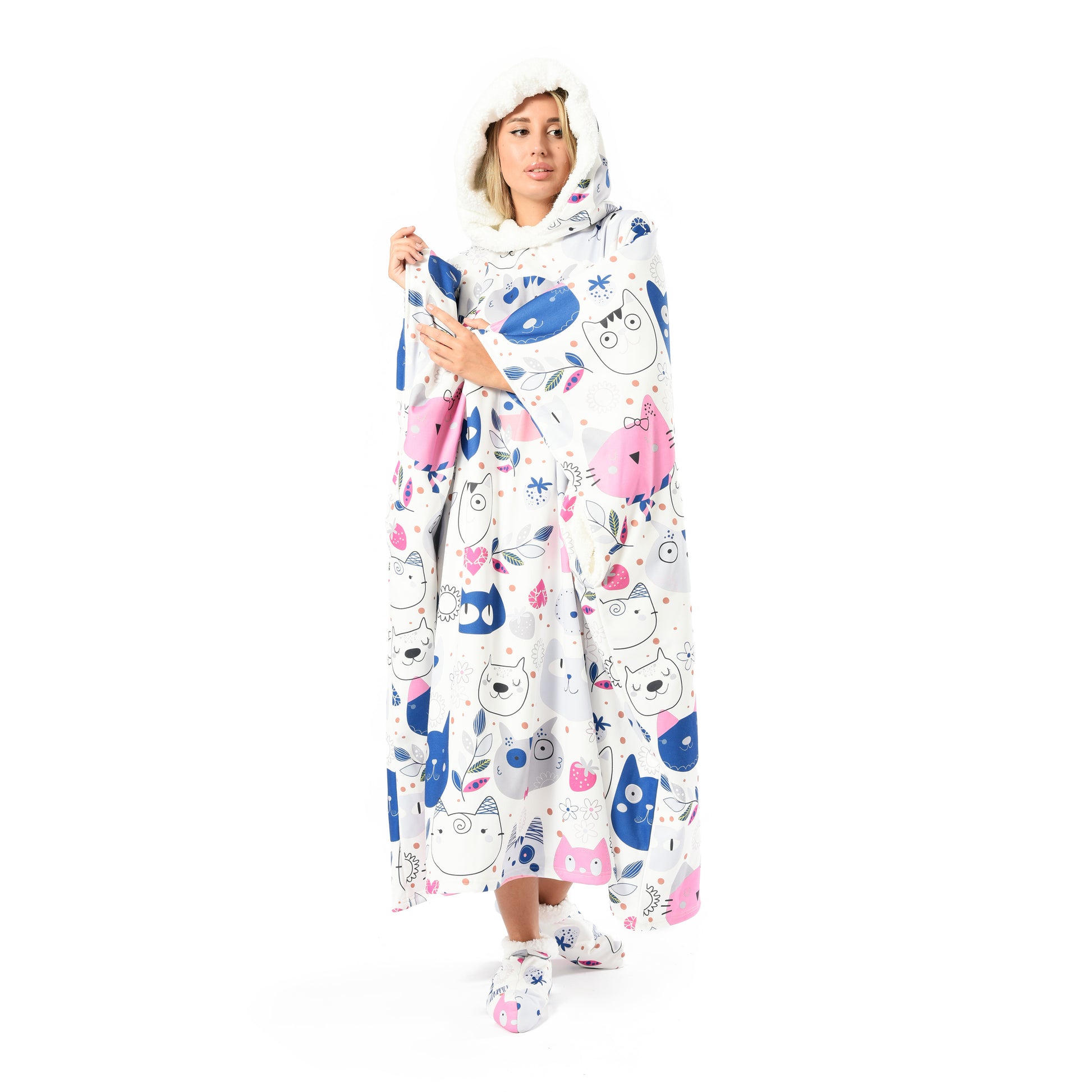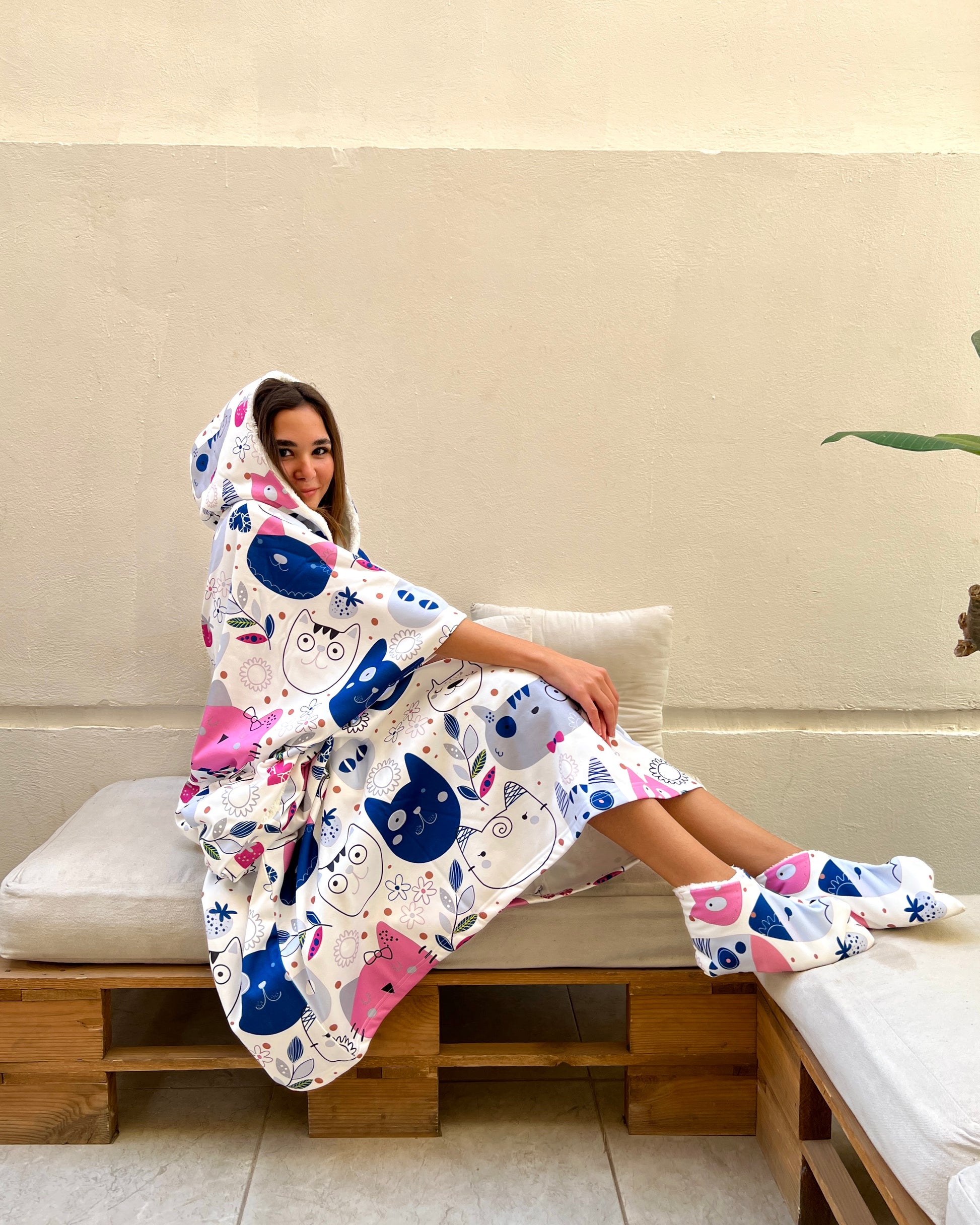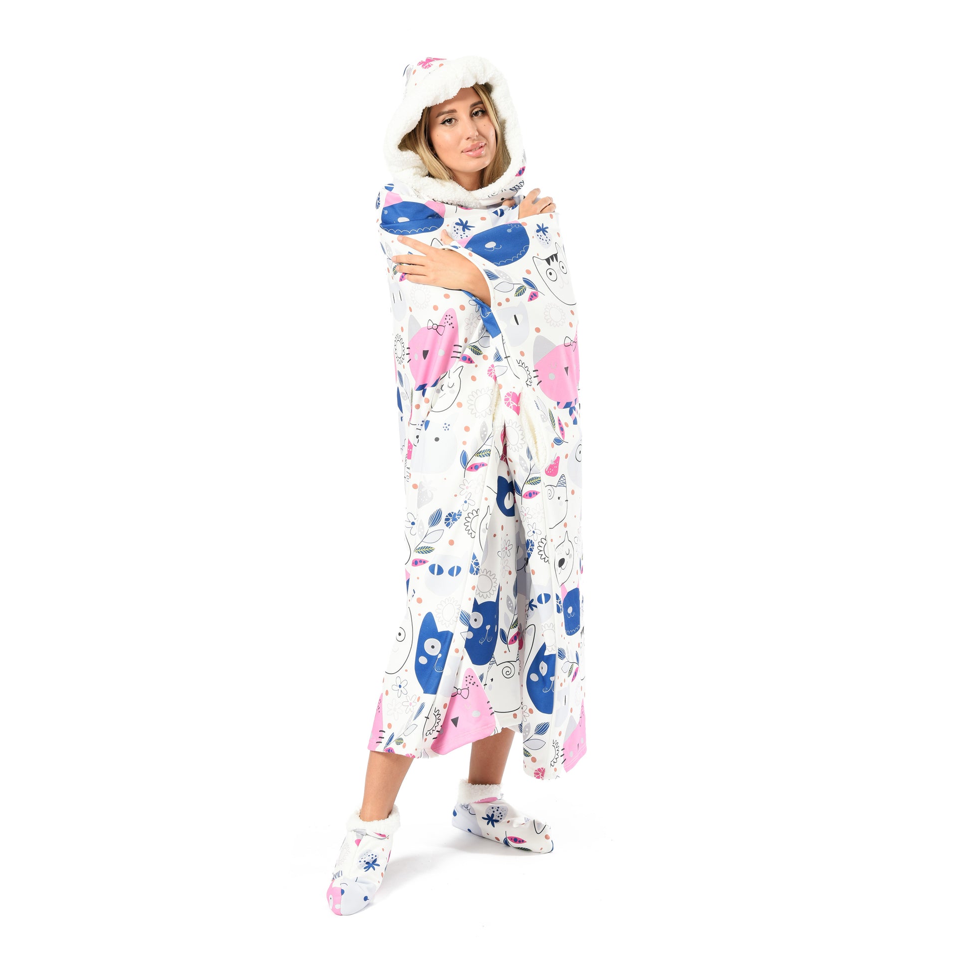 This oversized wearable blanket includes a large hood, two spacious side pockets, and matching fur socks β everything you need to stay snug and relaxed wherever you are.