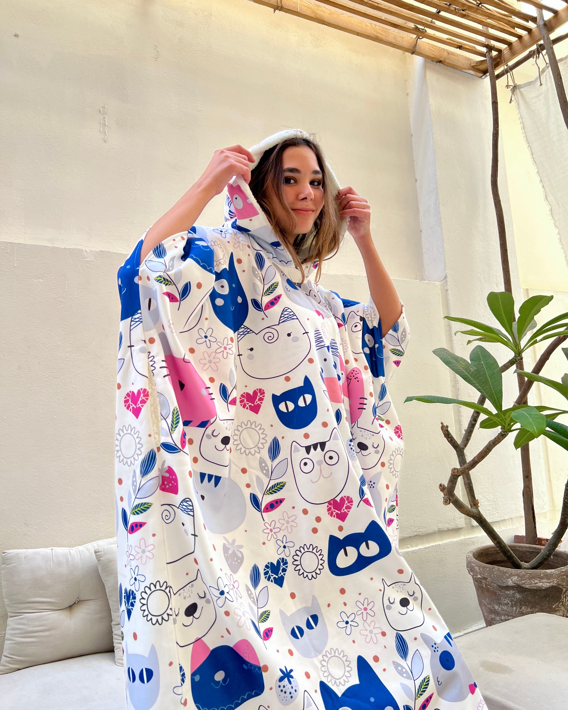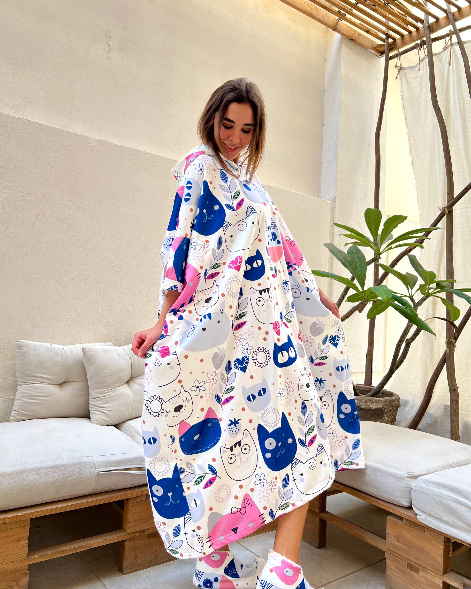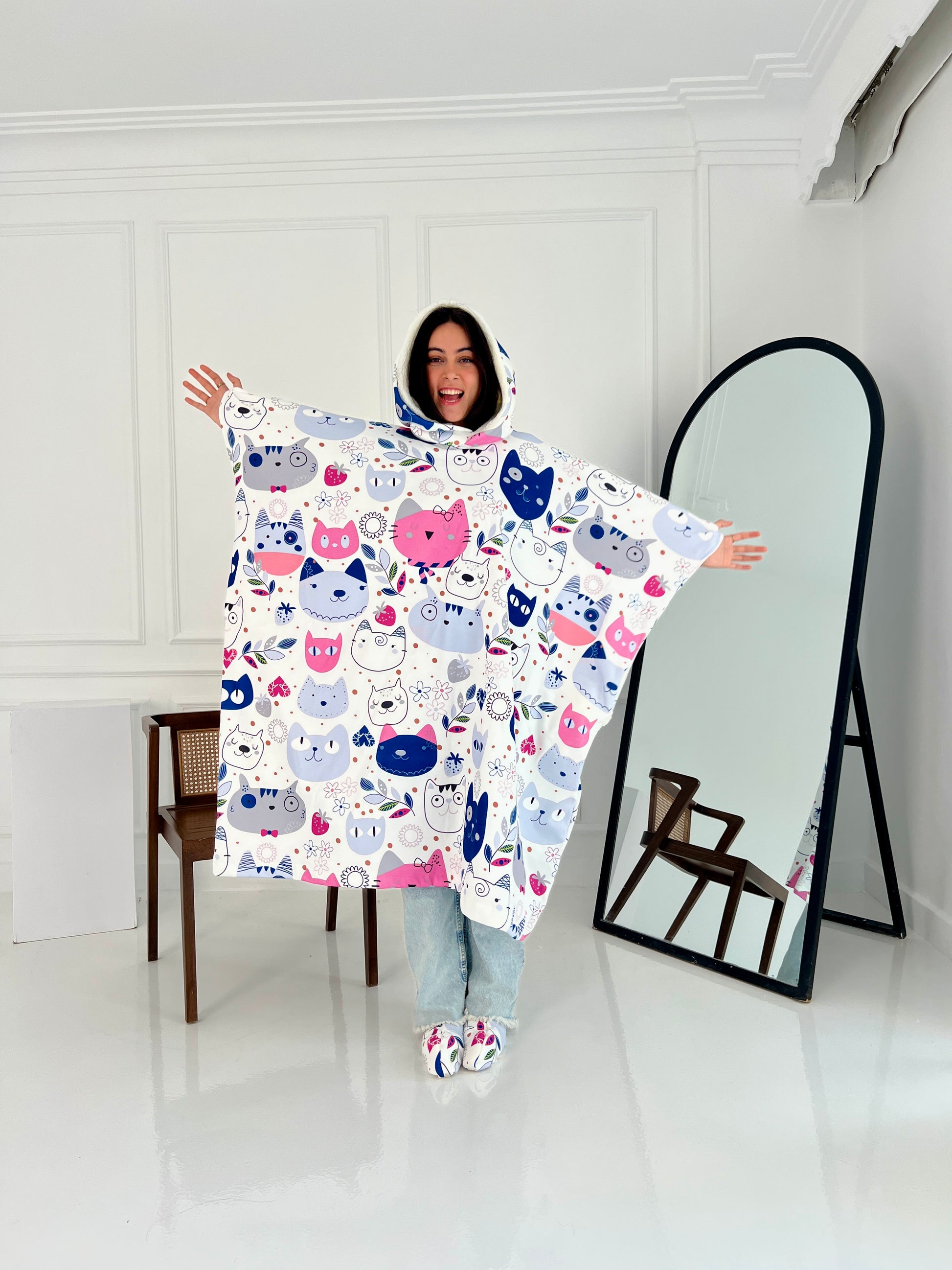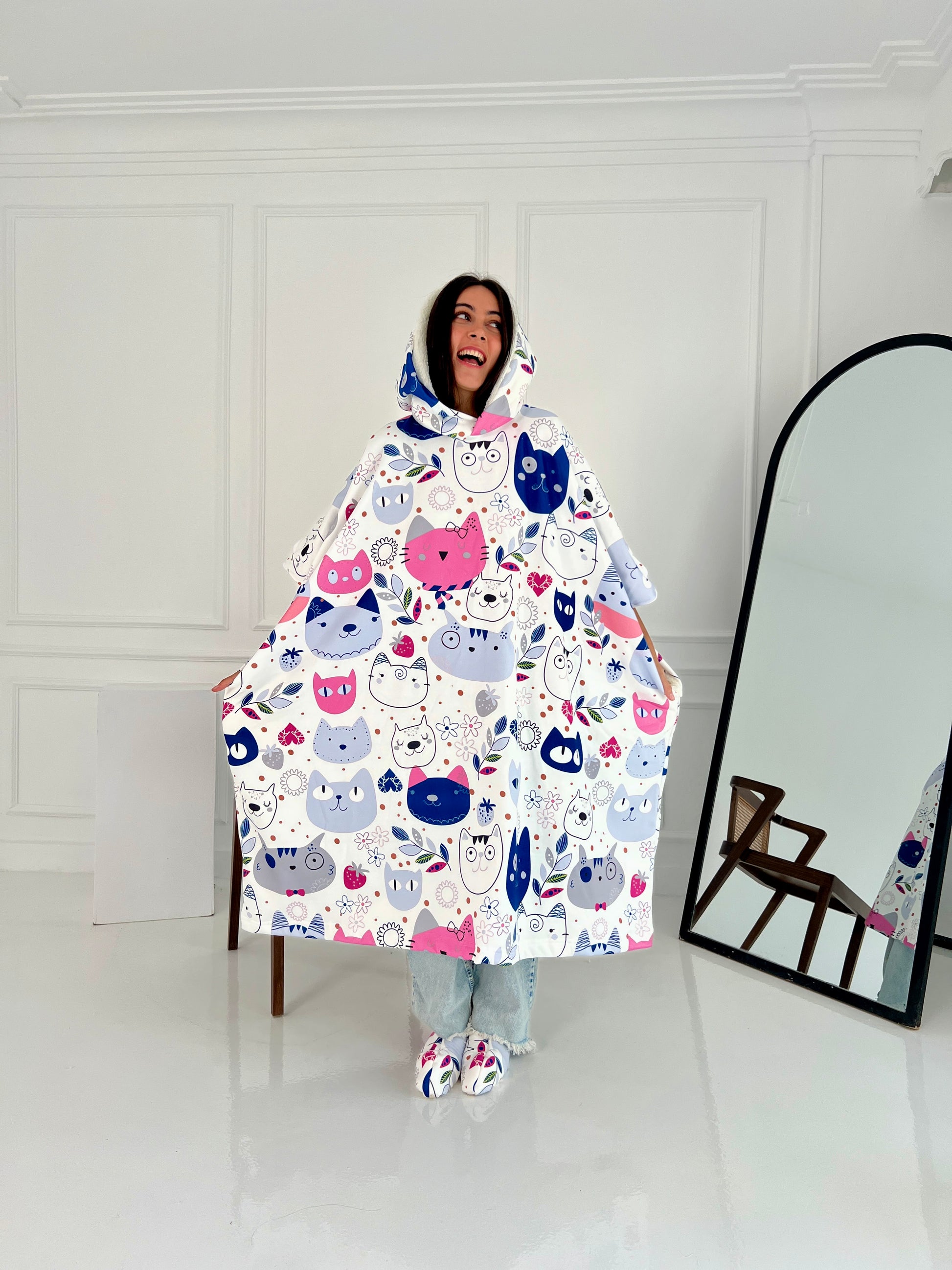 This oversized wearable blanket includes a large hood, two spacious side pockets, and matching fur socks β everything you need to stay snug and relaxed wherever you are.